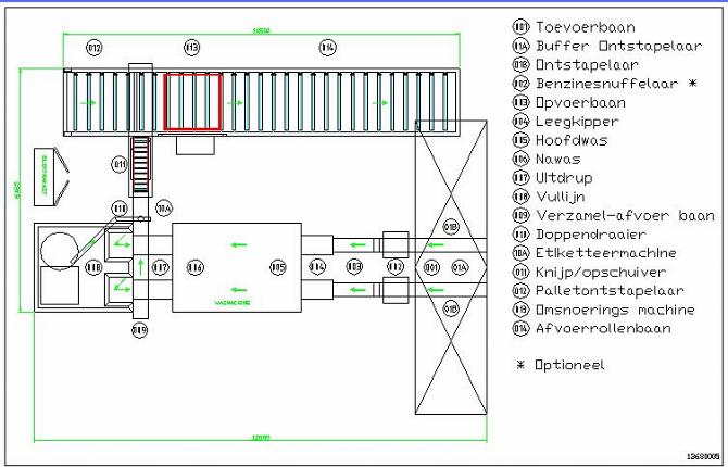 Voor een klant in de chemische industrie hebben we een verwerkingslijn voor jerrycans gefrabriceerd. Deze is opgebouwd volgens onderstaande tekening.